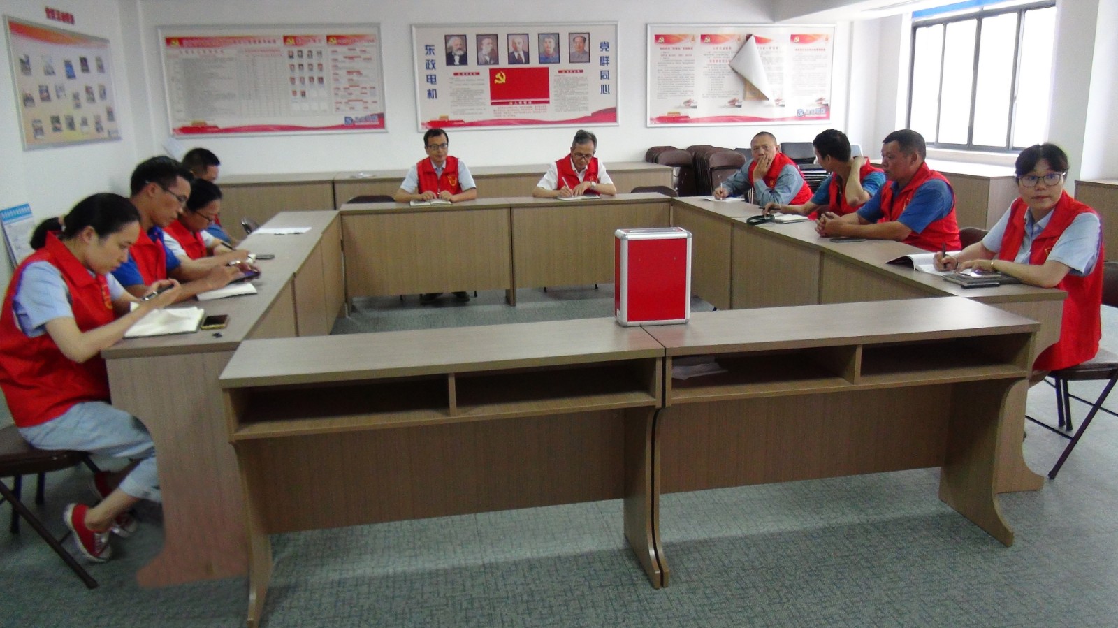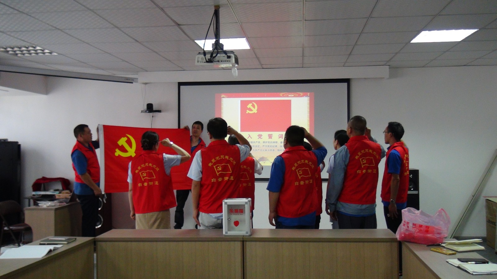 “我志愿加入中国共产党,拥护党的纲领,遵守党的章程,履行党员义务……”党员们高举右拳,面对鲜红党旗,重温入党誓词,坚定入党初心。